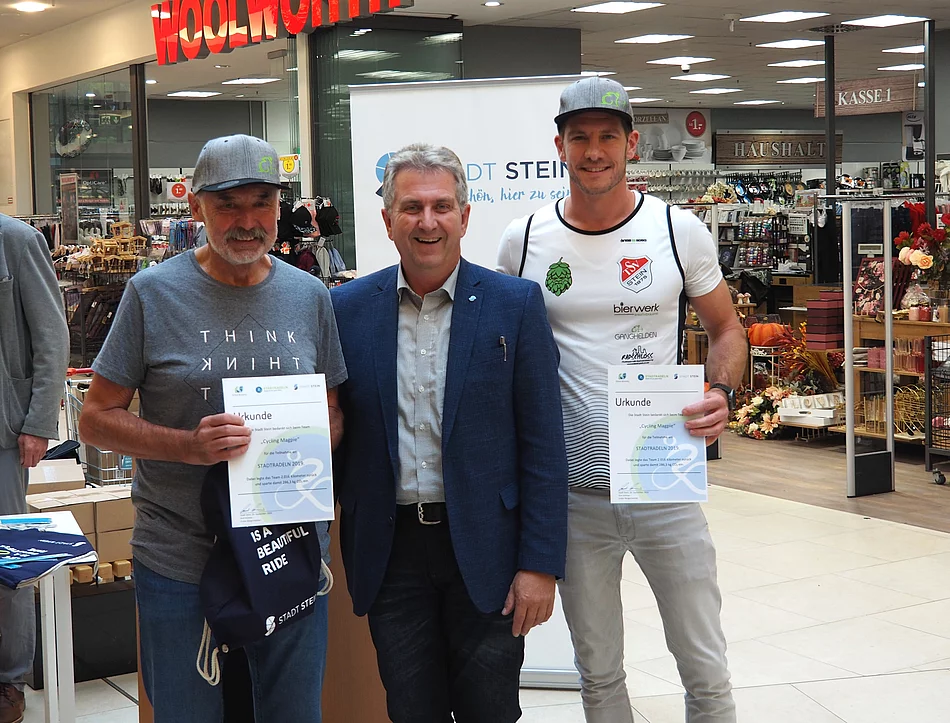Bürgermeister Krömer und der Radbeauftragte der Stadt Stein, Wolfgang Schaffrien, überreichten den drei Teams, die während des Aktionszeitraumes vom 30. Juni bis 20. Juli 2019 durchschnittlich die meisten Kilometer geradelt sind, einen Rucksack, eine Stadt-Stein-Tasse und ein Fahrradbeleuchtungsset der Marke Sigma. Über diese Preise durften sich das "Team Stumpf", das Team "Familie Ziegler" und das Team "Cycling Magpie" freuen. Den Teilnehmern des Teams "Cycling Magpie" wurden von Bürgermeister Krömer für ihre Leistung als bestes Team im Landkreis zudem hochwertige Füllfederhalter aus dem Hause Faber-Castell überreicht. Alle anderen Teilnehmer erhielten jeweils eine Urkunde, einen Rucksack und eine Stadt-Stein-Tasse. Als kleine Überraschung wurden alle Teilnehmer noch zu einem Eis eingeladen, so dass die Veranstaltung im wahrsten Sinne des Wortes ein süßes Ende fand.