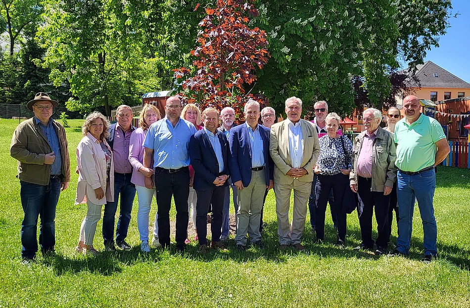Auch Steins Bürgermeister Kurt Krömer gratulierte der Stadt und den Falkensteiner Bürgerinnen und Bürger zu ihrem Stadterhebungsjubiläum in seinem Grußwort. Als Jubiläumsgeschenk übergab Kurt Krömer im Rahmen eines kleinen Festaktes im Stadtpark von Falkenstein im Beisein von Altbürgermeister Arndt Rauchalles, Bürgermeister Marco Siegemund und der Steiner Delegation einen Ahornbaum, als Zeichen der Verbundenheit mit den Freunden aus Falkenstein.